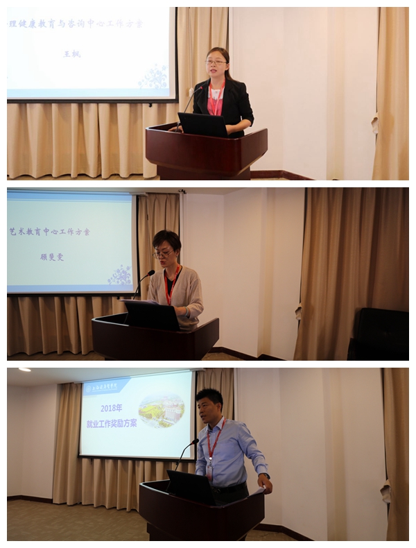根据会议议程,心理健康教育与咨询中心副主任王枫、艺术教育中心主任顾斐雯围绕指导思想、工作原则、目标与任务和具体措施等方面分别对“中心”《工作实施方案》进行阐述,着力推动我校培养身心健康的人才工作,推动我校学生审美和人文素养提升的艺术教育工作,全力实施人文与实践“双螺旋”的人才培养模式,促进学生全面发展;学生处副处长慈兴强介绍了2018年就业工作奖励方案,并对2019年毕业生就业工作进行了部署。