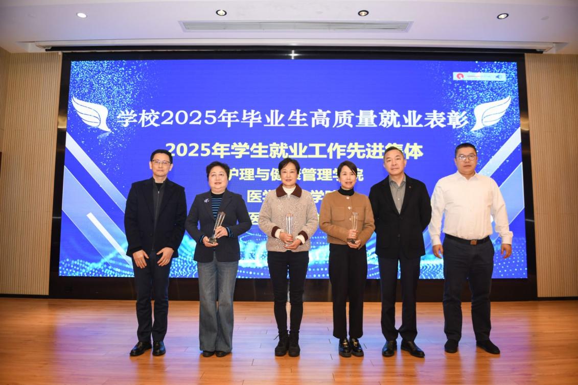 副校长马耀良、汤磊、吴晓晖为2025年学生就业工作先进集体,护理与健康管理学院、医学技术学院、医学影像学院颁发奖杯。