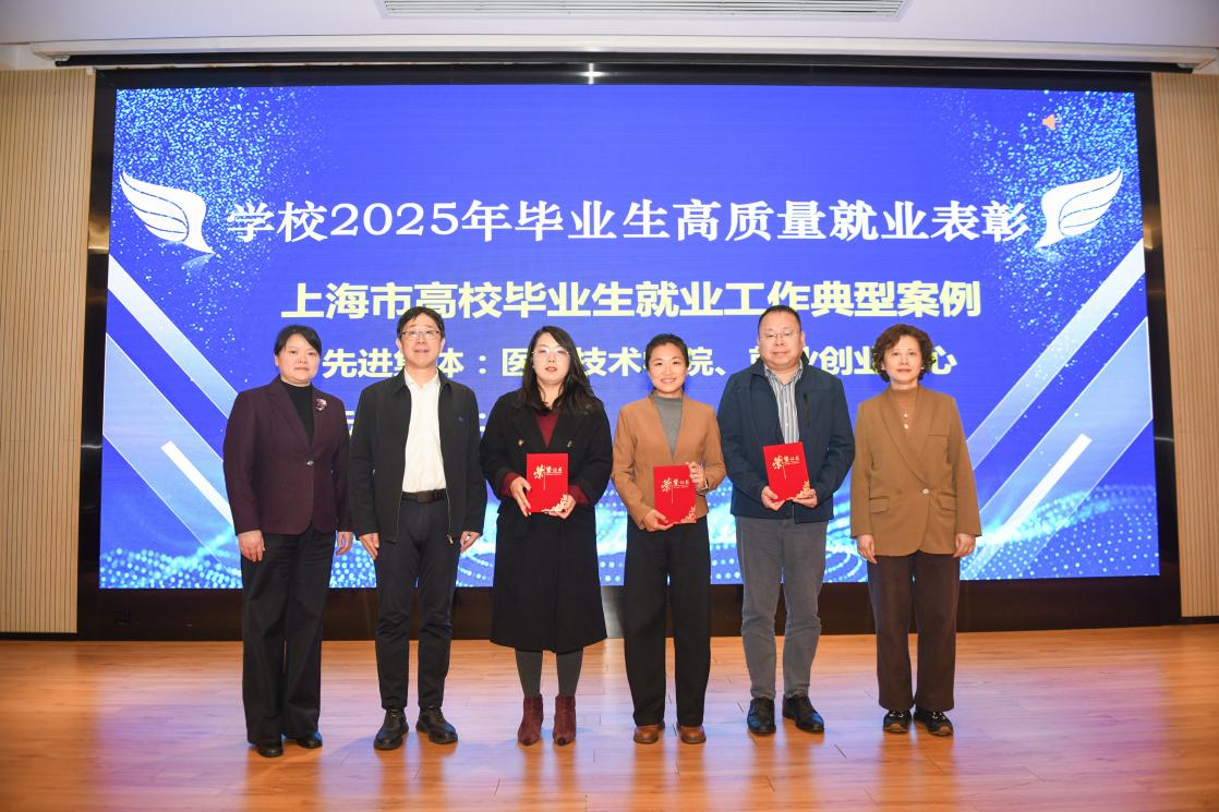党委副书记唐红梅,党委副书记、副校长王庆华,党委副书记周宁慧为荣获2025年上海市高校毕业生就业工作典型案例的集体——医学技术学院、就业创业中心颁奖,并为获评个人护理与健康管理学院李影颁奖。