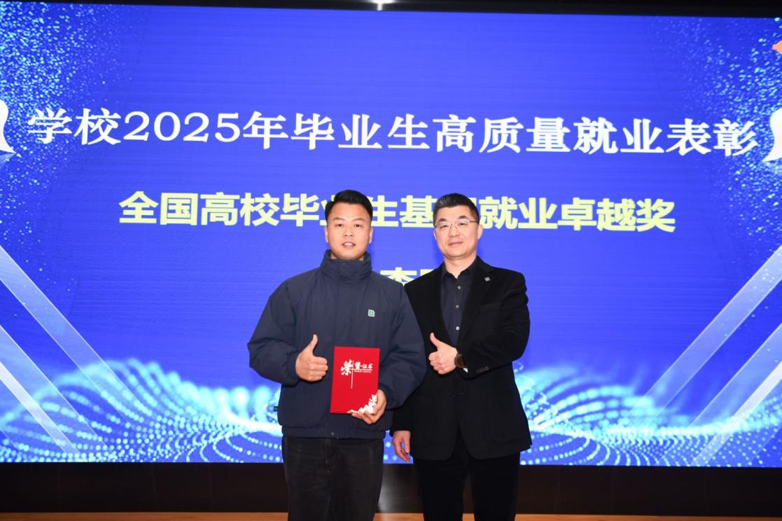为表彰先进、树立榜样,进一步激发全校就业工作积极性,会上同时对2025年为就业作出突出贡献的个人和集体进行了表彰。校长吴韬为荣获 “2024—2025年度全国高校毕业生基层就业卓越奖” 的护理与健康管理学院毕业生边李园(现就职于上海市崧泽强制隔离戒毒所,四级警长)颁发荣誉证书。学校始终高度重视基层就业引导工作,学生积极响应国家 “到基层去、到西部去、到祖国最需要的地方去” 的号召,扎根基层、服务社会。