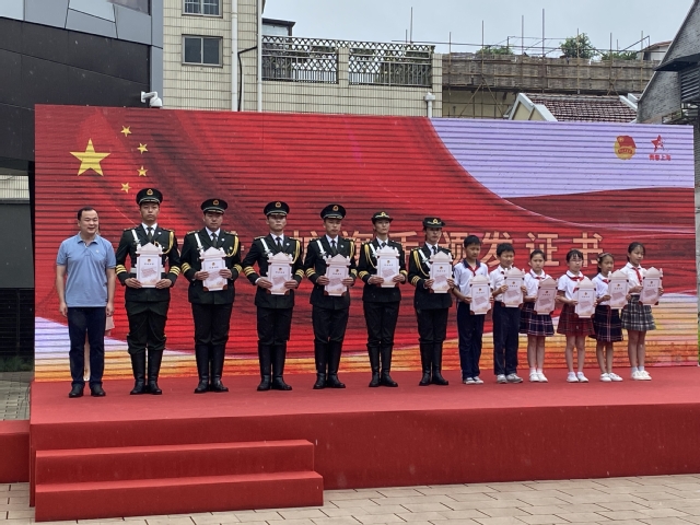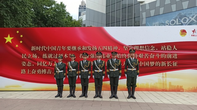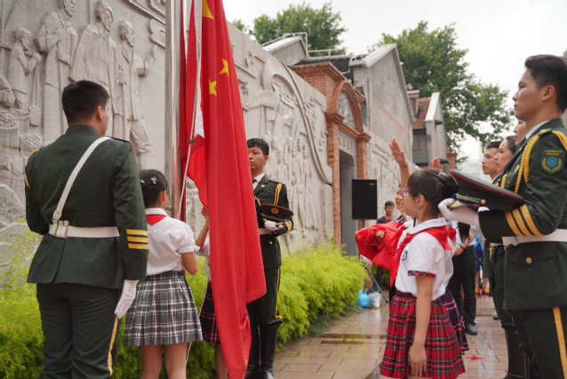 6月27日上午,由共青团上海委员会等单位联合主办的“国旗下成长”——上海市非公有制经济组织团员青年庆祝中国共产党成立99周年升旗仪式在渔阳里举行。我校6名仪仗队队员携各非公企业招募的小小升旗手、护旗手,共同完成了出旗、升旗仪式。团市委副书记邬斌为仪仗队队员们颁发纪念证书并合影。