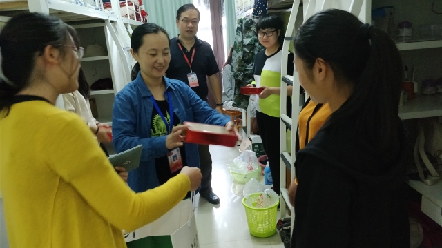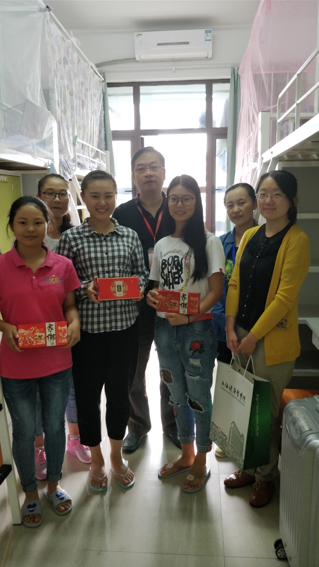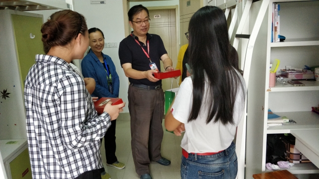 本次发放的月饼是由我校食堂制作的,印有学校logo,极富学校特色。9月28、29日两天,各学院领导和老师走进学生宿舍,对困难生进行走访慰问,与学生亲切交谈,并亲手将月饼送到学生手上。同时,给94名清真学生发放了水果。